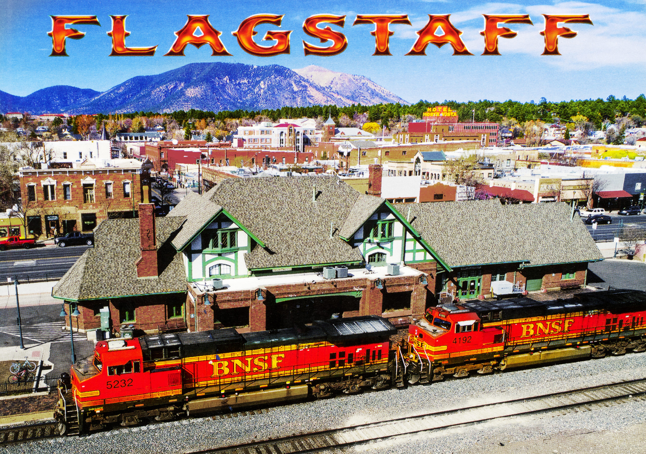 Rest Stop Outside El Centro Then Gas and Sunset at Gila BendThe depot at Flagstaff has been an integral part of the city since 1926, the year it was built by the Atchison, Topeka and Santa Fe Railway. This Tudor Revival brick building with its cross-gabled roof was designed by one of the railroad’s engineering staff. It stands at what has historically been one of the busiest railroad corridors for both freight and passenger rail in the United States. The station also serves as the city’s Visitors Center – Great American Train StationsThe View From Flagstaff – The snow topped Humphrey’s Peak of the trio called San Francisco PeaksLogging Wheel. Once an integral part of the logging industry in this area. From 1870 they were used to help clear timber from land for farming. Cut trees and logs were chained up underneath and rolled away to clear the land. But in the 1880’s they were commonly used in the logging industry. Wheeling cut trees away to railroad flat cars. Humphreys PeakFlagstaff AZ Walkabout. Ghost Sign for Mission Ice Cream and frozen bars is on the corner of Aspen Avenue and San Francisco Street on the side of what is now the Mountain Sports store.Mountain Sports Store/Flagstaff Elks Building, 24 N. San Francisco Street The A•B•C ghost sign at 16 Route 66, Flagstaff Brewing CompanyMany of Flagstaff’s buildings are made of stone.11 South Beaver Street Burly Fish Tattoo and Piercing 11 Beaver StreetThe Hopi Building is a retail-owned property of the Hopi tribe located in Heritage Square in Flagstaff, Arizona. It was formerly known as the “Heritage Square” building, but it was christened the “Hopi Building” on 5 October 2010.The Babbitt Brothers Building, San Francisco Street at Aspen Avenue. The story of the Babbitt Brothers requires a deep dive beyond the space provided here. But it’s a rich story. https://enjoyflagstaff.com/babbitt-brothers-flagstaff/The National Register Bank Hotel Building. Dating back to 1888 as a bank and hotel, then later it became the McMillan Opera House. In 1892 it was also a stop for the Flagstaff-Grand Canyon Stagecoach.Hotel Monte Vista, located at 100 North San Francisco Street, was built in 1927 and is a centerpiece of the historic downtown district. It contains 73 rooms and suites on three floors. Many famous people have spent the night at the Hotel Monte Vista, including Hollywood icons John Wayne, Spencer Tracy, Humphrey Bogart, Clark Gable, Anthony Hopkins, Esther Williams, and Barbara Stanwyck. It’s a favorite of ghost hunters – there have been many alleged ghost sightings at the Hotel Monte Vista. One of the sightings involves a “Phantom Bell Boy” that knocks on guests’ doors in the middle of the night and will talk to the guest.The 1929 Motor Tourist Hotel – Motel Du Beau. The iconic 80 neon tower came in the early 1030’sThe Downtowner was built in 1919. K. J. Nackard made it into an “auto inn” during the 1930’s. Today it’s the Grand Canyon International Hostel. Altitudes Bar and Grill, 2 South Beaver StreetLeaving Flagstaff, an abandoned Route 66 truss bridge. The San Francisco Peaks in the background.