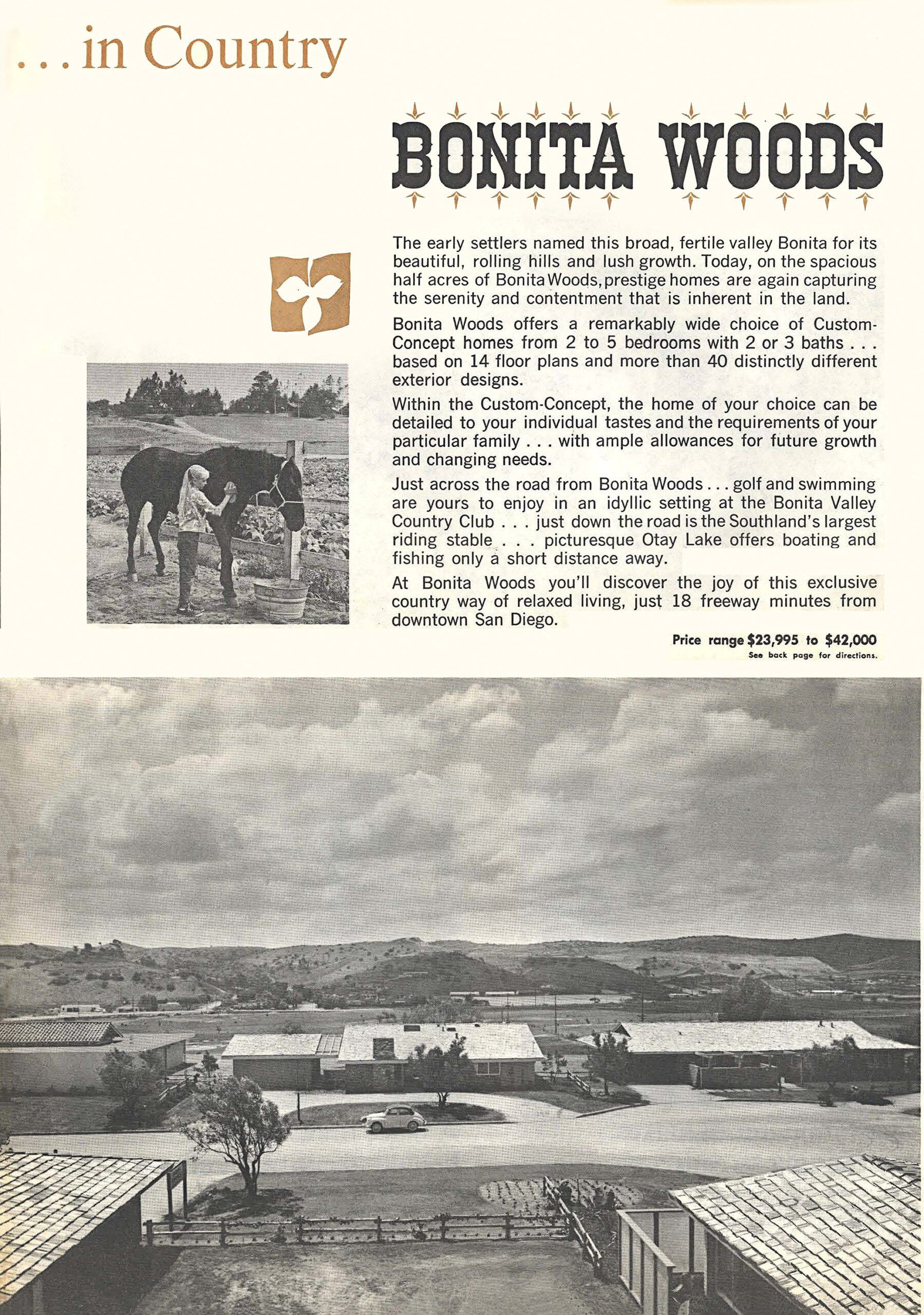 “The two largest residential subdivision now being developed, Bonita Woods and Bonita Bel Air, are on the opposite rims of the valley where each home site is at least one-half acre or more. The homes are large and far above the average in cost, with prices starting at $24,000 and ranging up to the $40,000 – $50,000 bracket.